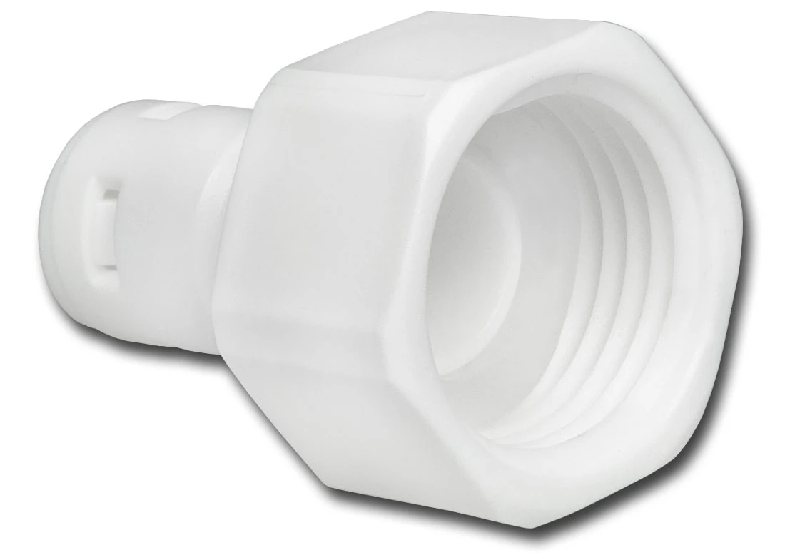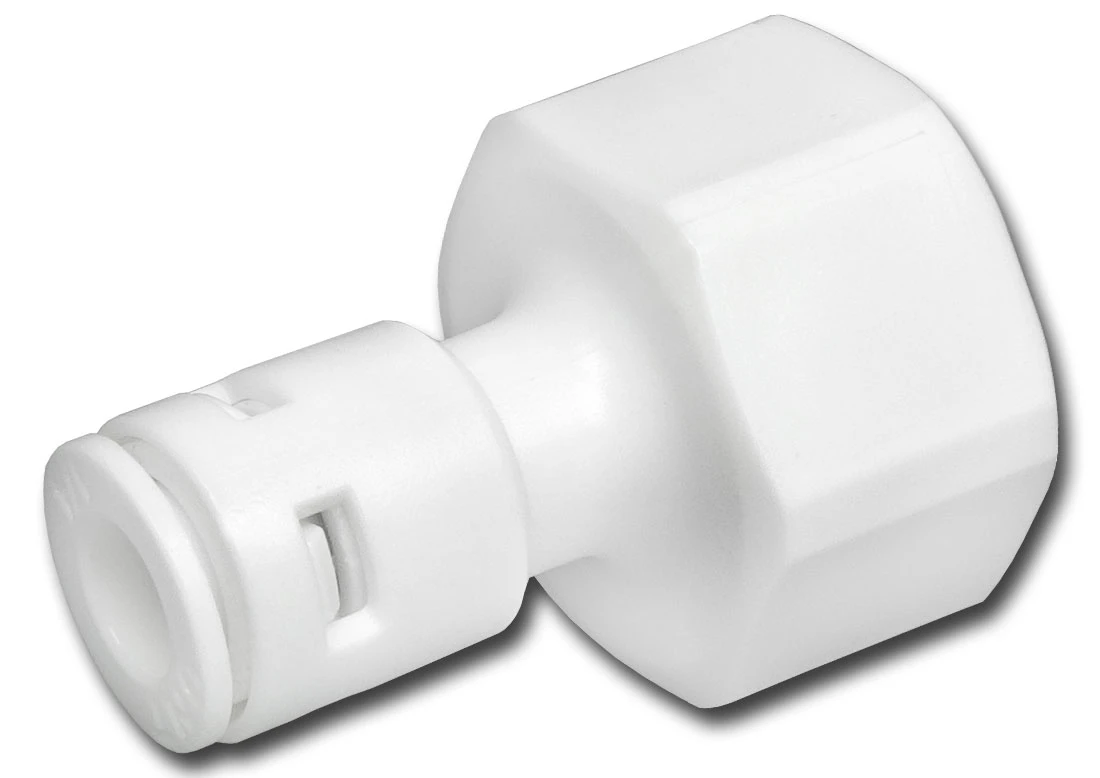 Złączka redukcyjna Aquafilter A4FA12 umożliwiająca podłączenie wężyka elastycznego 1/4 cala (ok. 6,4 mm) z instalacją wodną średnicy 1/2 cala. Złączka posiada z jednej strony gwint wewnętrzny 1/2 cala z przejściem na drugą stronę, na wężyk.