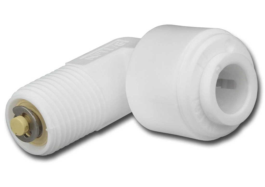 Zawór zwrotny umieszczony jest wewnątrz kolanka z gwintem 1/8 cala, wkręcanym na wyjściu wody czystej w obudowie membrany. Drugi koniec to standardowe podłączenie na wężyk 1/4 cala, stosowany w domowych filtrach wody.