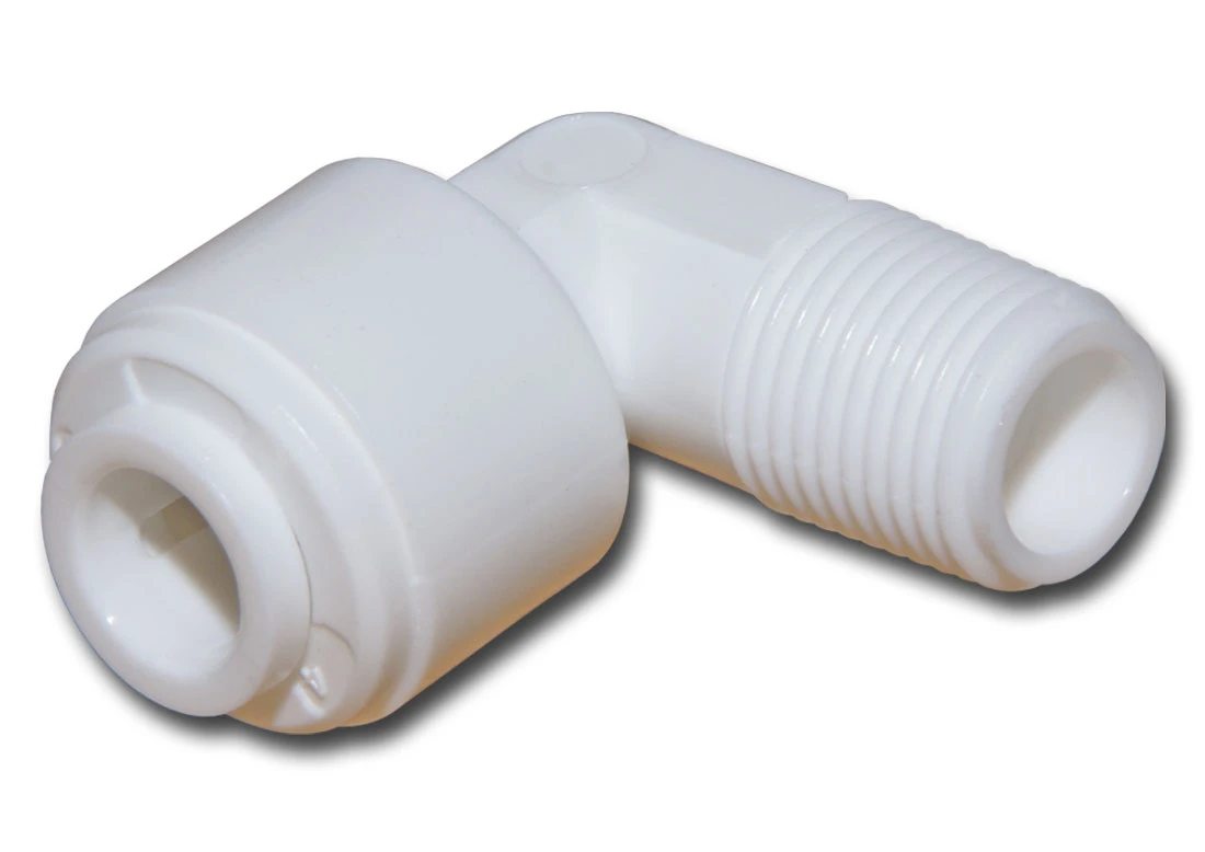 Kolanko typowo stosowane jest na wejściu wody na obudowę membrany oraz na wyjściu wody brudnej z membrany do kanalizacji. Elementy połączeniowe w kolanku to gwint zewnętrzny oraz szybkozłączka z mechanizmem JG (samouszczelnianie i mocowanie).