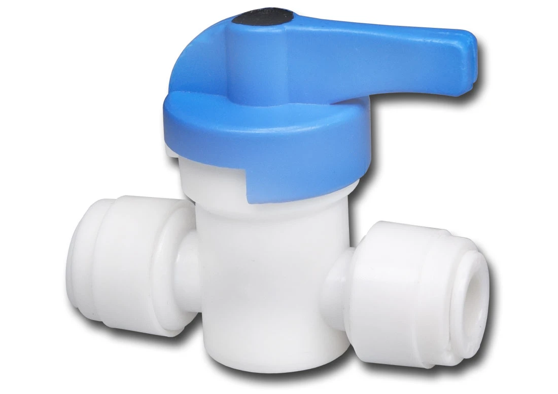 Zawór kulowy, przelotowy, na wężyk standardu 1/4 cala. Pozwala na regulowanie przepływem wody oraz na jej całkowite odcięcie.