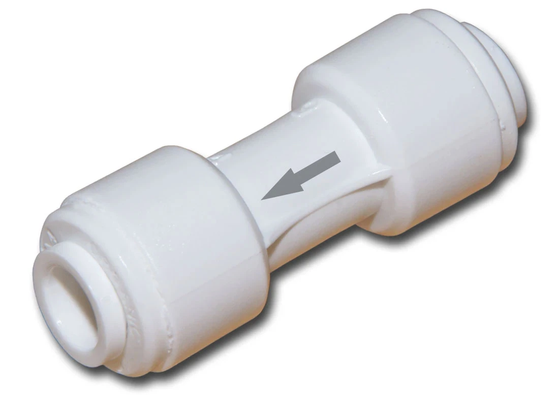 Zawór zwrotny, przelotowy, na wężyk standardu 1/4 cala. Pozwala na przepływ wody wyłącznie w jednym kierunku (oznaczonym strzałką).