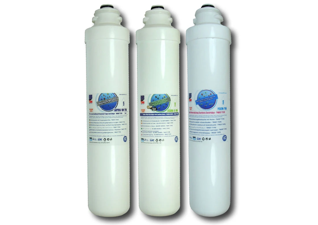 Zestaw wkładów Aquafilter do systemów uzdatniania wody w których wykorzystano technologię TWIST do mocowania, stabilizowania i uszczelniania wkładu w filtrze. Jest to zarazem najłatwiejszy sposób na samodzielną wymianę wkładów - jeden ruch dłonią o 1/4 obrotu wystarczy do demontażu wkładu i odpowiednio do zamontowania nowego.