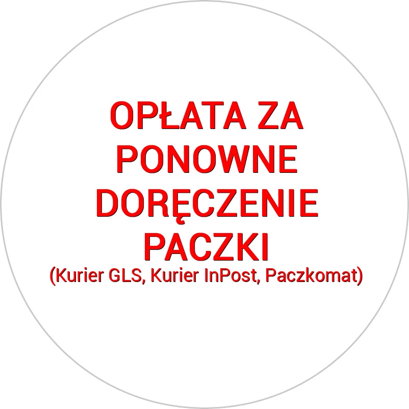 Opłata za zwrot i ponowne nadanie paczki nieodebranej przez odbiorcę. Kwota uwzględnia koszt ponoszony przez naszą firmę za zwrot i ponowne nadanie paczki (firma spedycyjna obciąża naszą firmę).